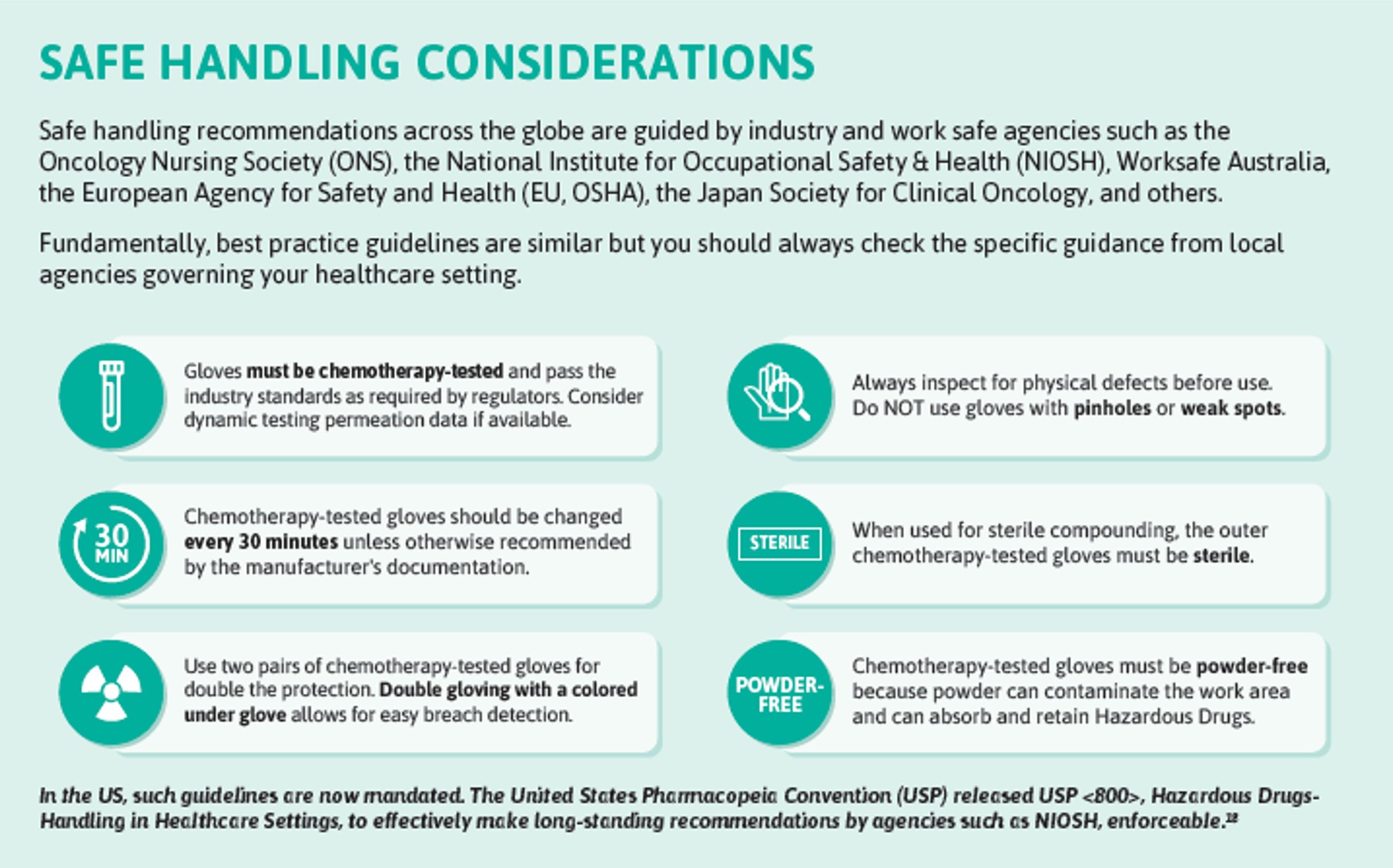 Referenzen: 1. IARC, GLOBOCAN 2012: „Estimated cancer incidence, mortality and prevalence worldwide in 2012“. 2. IARC GLOBOCAN 2018, „Global Fact Sheet“, letzter Zugriff: 13. September, 2020: https://www.uicc.org/news/new-global-cancer-data-globocan-2018. 3. ASTM steht für die US-amerikanische American Society of Testing & Materials; EN steht für Europäische Norm. 4. Nalin M., Hug G., Boeckmans E., Machon C., Favier B. and Guitton J. „Permeation measurement of 27 chemotherapy drugs after simulated dynamic testing on 15 surgical and examination gloves: A knowledge update“, Journal of Oncology Pharmacy Practice 2020;0(0):1-14. 5. Landeck L., Gonzalez E., Koch O.M. „Handling chemotherapy drugs-Do medical gloves really protect?“, Int J Cancer. 2015;137(8):1800-1805. doi:10.1002/ijc.29058. 6. Phalen R.N., Le T., Wong W.K. „Changes in chemical permeation of disposable latex, nitrile, and vinyl gloves exposed to simulated movement“, J Occup Environ Hyg. 2014;11(11):716-721. doi:10.1080/15459624.2014.908259. 7. Dillon J. und Schroeder L. „Permeability and material characteristics of vulcanized latex film during and following cyclic fatigue in a saline environment“, Journal of Applied Polymer Science, 1997;64(3):553-566. 8. Zum Zeitpunkt der Veröffentlichung ist Ansell der einzige Handschuhproduzent mit einem eigenen dynamischen Testsystem mit der Bezeichnung „Ansell Dynamic Testing Device“ (ADTD). 9. Sessink P.J., Bos R.P. „Drugs hazardous to healthcare workers. Evaluation of methods for monitoring occupational exposure to chemotherapeutic drugs“, Drug Saf. 1999;20:347–59. 10. Oriyama T., Yamamoto T., Yanagihara Y. et al. „Evaluation of the permeation of antineoplastic agents through medical gloves of varying materials and thickness and with varying surface treatments“, J Pharm Health Care Sci. 2017;3(13). 11. Das ACPP verwendet die Techniken „Induktiv verkoppelte Plasma-Massenspektroskopie“ (ICP-MS) und „Flüssigchromatografie-Massenspektrometrie“ (LC-MS/MS). 12. Cancer Medicine 4th Edition, Encyclopedia of Cancer, Cancerologie Clinique Thérapeutique du Cancer, Compendium 20th Edition. 13. Ivanova K, Avota M. Antineoplastische Medikamente: Berufliche Exposition und Nebenwirkungen. Proceedings of the Latvian Academy Of Sciences. 2016;70(5):325–329. doi:10.1515/prolas-2016-0049. 14. Hon C., Teschke, K. Demers, P. Venners, S. „Antineoplastic drug contamination on the hands of employees working throughout the hospital medication system“, Ann Occup Hyg. 2014;58(6): 761-770. 15. Tracy Wyant, DNP, RN-BC, AOCN®, CHPN®, CPPS. https://voice.ons.org/newsand-views/what-is-onss-stance-onhandling-chemotherapy-while-pregnant-breastfeeding-or-trying. Letzter Zugriff am 17. September 2020. 16. . Bertrand Favier Thesis, Krankenhauspharmazeut, Centre Régional Léon-Bérard, Lyon – Frankreich. 17. Hall A, Demers P, Astrakianakis G, Ge C, and Peters C. Estimating National-Level Exposure to Antineoplastic Agents in the Workplace: CAREX Canada Findings and Future Research Needs“, Annals of Work Exposures and Health. 2017;61(6):656-658. 18. https://www.usp.org/compounding/general-chapter-hazardous-drugs-handling-healthcare. Letzter Zugriff am 17. September 2020.