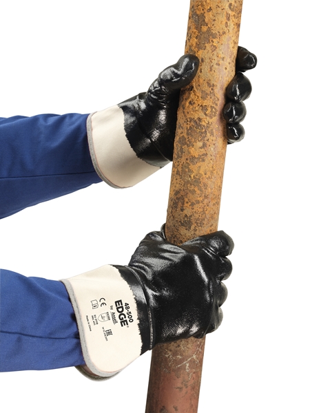Garantierte Haltbarkeit: Die vollständig nitrilbeschichteten, geschnittenen und genähten Schwerlasthandschuhe EDGE® 48-500 bieten ein hohes Maß an Widerstandsfähigkeit gegen abrasive Materialien und Gefahren bei der Handhabung schwerer Aufgaben.