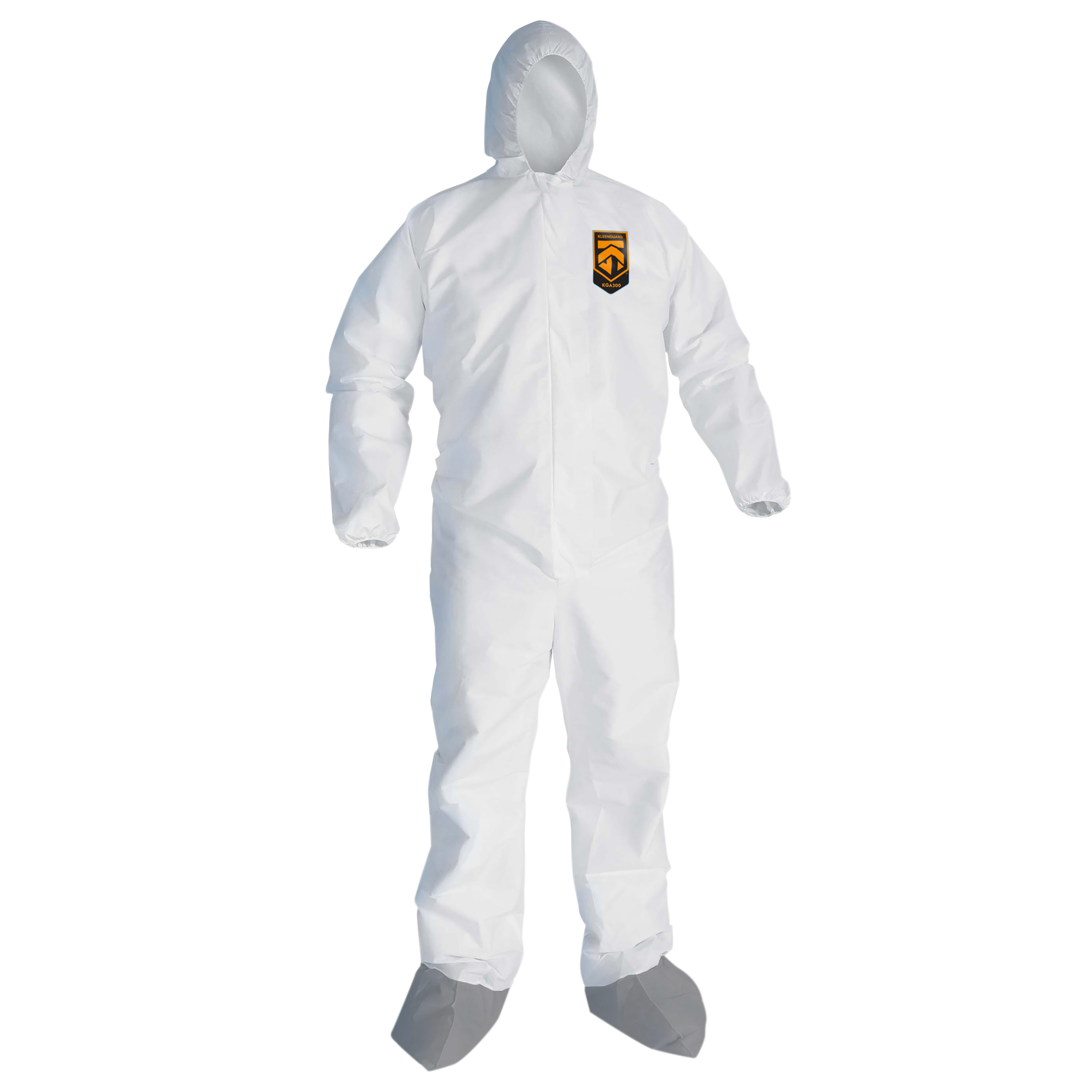 Water-resistant design: KleenGuard™ KGA300 Coveralls feature serged seams and a water resistant front zipper, and come in a variety of sizes and configurations, including open or elastic wrists and ankles, elastic back, a respirator-fit hood, and non-skid boots (depending on the model)