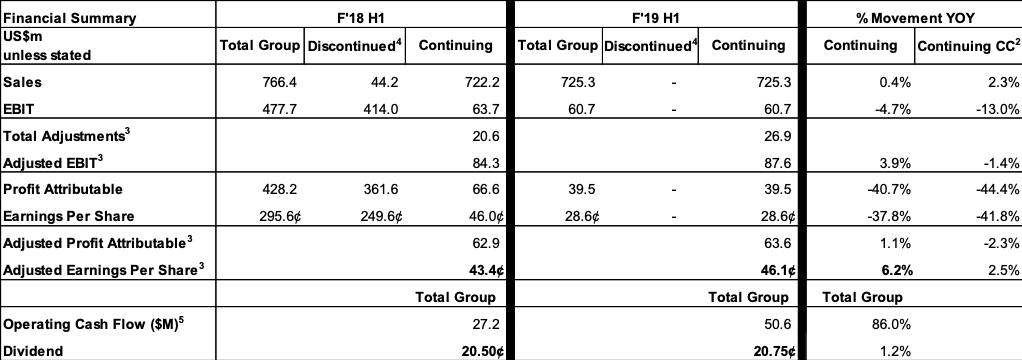 • EPS of US28.6¢, down YoY on expenses from Transformation Program and absence of one-time tax benefits in F’18 H1