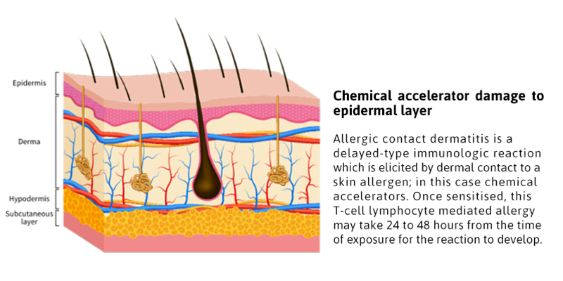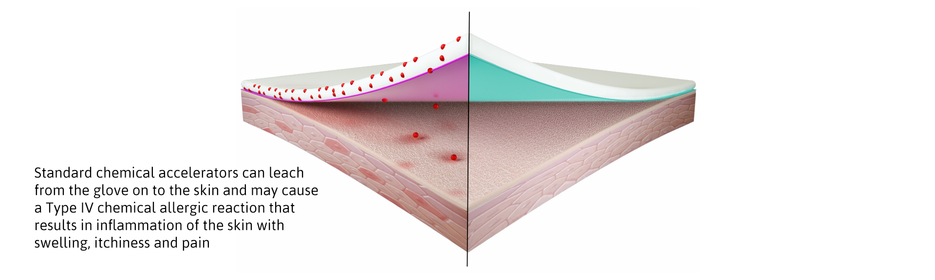 Katalizatory chemiczne należą do najczęstszych alergenów powodujących ACD u pracowników służby zdrowia i znajdują się zarówno w rękawicach lateksowych, jak i syntetycznych, wykonanych z poliizoprenu, neoprenu lub nitrylu. Zadaniem katalizatorów jest wspieranie reakcji sieciowania siarki w rękawicach z lateksu naturalnego i w rękawicach syntetycznych w celu nadania wytrzymałości i trwałości powłoce. Jednak gotowy produkt może zawierać śladowe ilości katalizatorów chemicznych. Ponieważ wiele z tych konwencjonalnych akceleratorów ma cząsteczki o niewielkich rozmiarach, są one słabo rozpuszczalne w powłokach, co oznacza, że z czasem przedostają się na powierzchnię rękawicy, zwiększając ryzyko wystąpienia opóźnionych reakcji alergicznych.